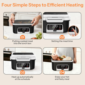 You set the mealtime, and the lunch box heats in advance automatically. It also supports instant heating when needed. Note: set the device to local time before using scheduled heating.