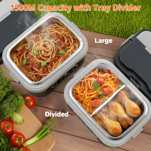 This 1.5L cordless electric lunch box for adults features automatic heating, an 18000mAh rechargeable battery, and a portable design with an insulated bag and tray divider—ideal for office, truck, and outdoor use.