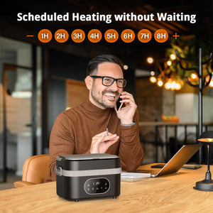 Features adjustable timing settings from 1 to 8 hours, allowing meals to heat automatically before mealtime. Warm mode maintains food at a comfortable serving temperature.