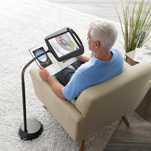 Enhance daily tasks using this floor lamp equipped with a large magnifying lens for clear page viewing and detailed crafts. The bright lighting and adjustable arm help you position the lens exactly where needed, making reading, hobbies, and close-up projects easier at home or in work areas. Its full-page lens design supports wide viewing while keeping hands free.