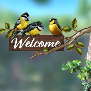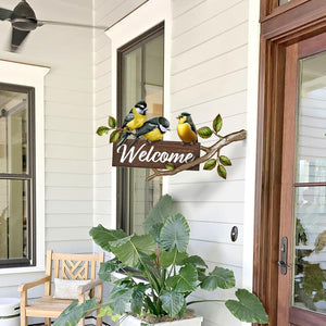 Create a welcoming atmosphere with this metal art for outside featuring a lovely bird figurine and a 'Welcome' sign.