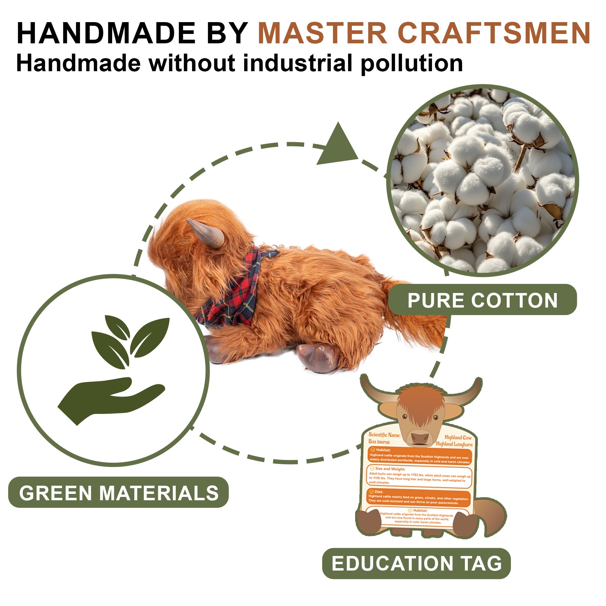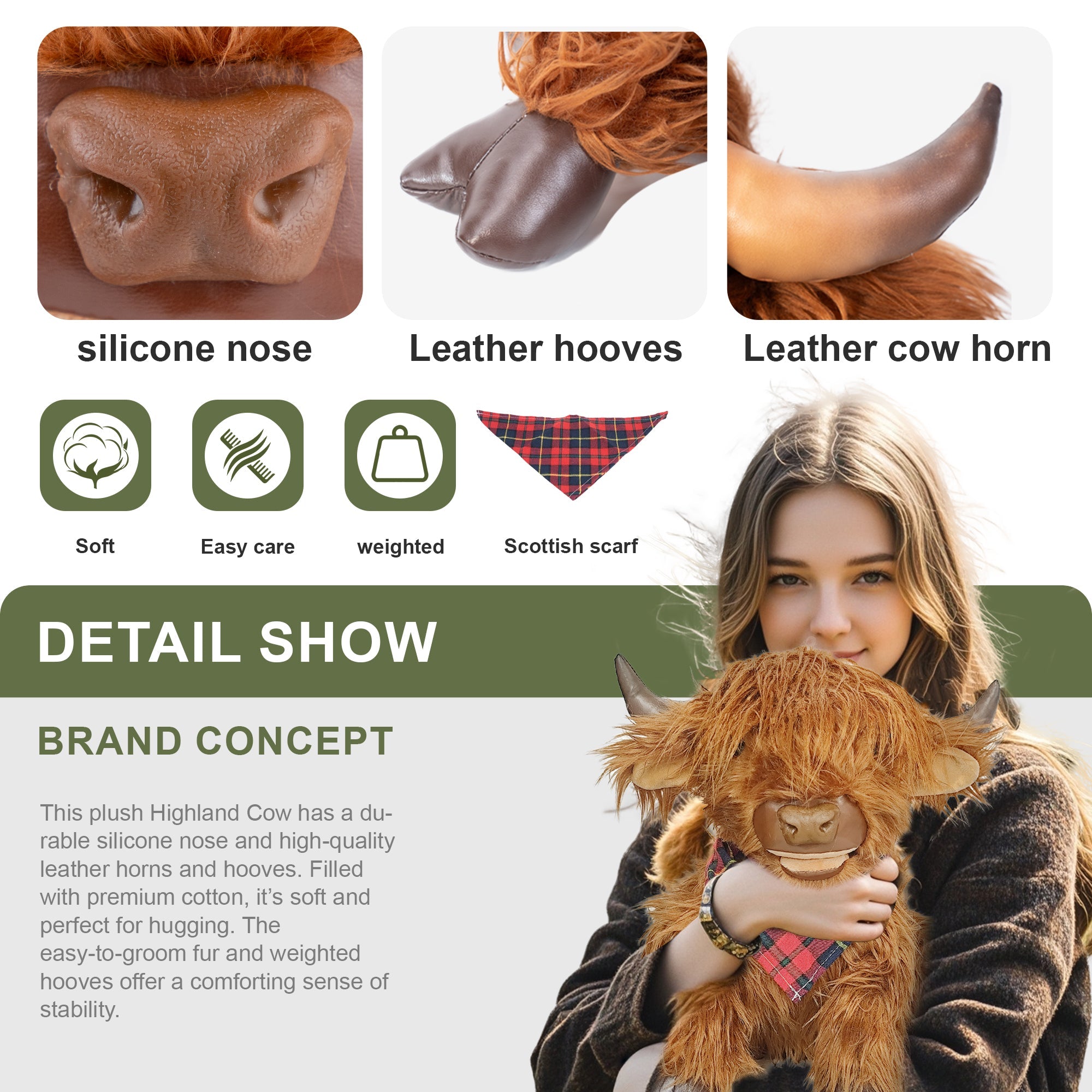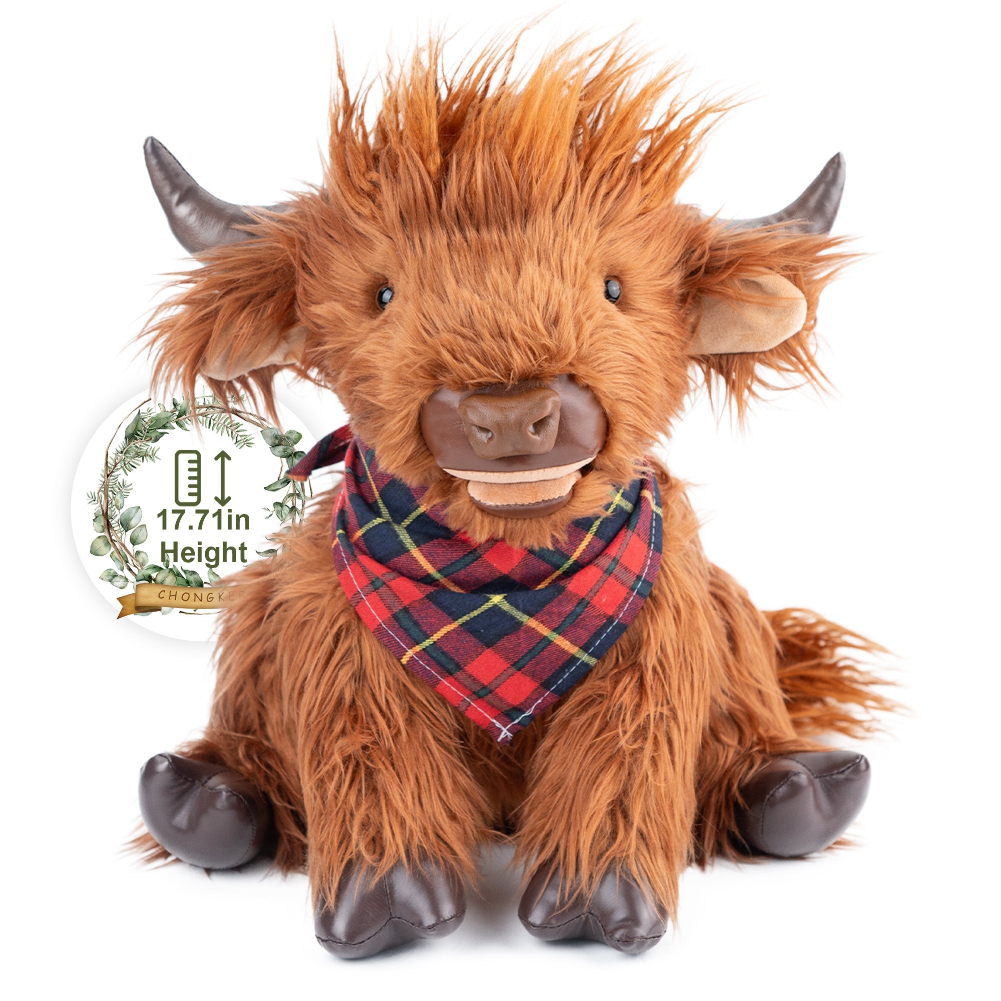 【Realistic Highland Cow Design】Designed with carefully crafted details, this plush cow features a signature shaggy brown coat, small pointed horns, expressive eyes, and soft, squishy hooves. The cozy scarf adds a charming seasonal touch, making it especially perfect for holiday decor.