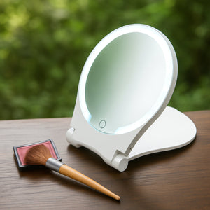 This makeup mirror delivers clear 10X magnification plus bright LED lighting to help with detailed makeup tasks anywhere. The slim travel mirror design folds to under 1 in (2.54 cm), making it simple to pack. A built-in touch control adjusts brightness, while the rechargeable battery and USB charging keep the vanity compact ready for daily use or trips.