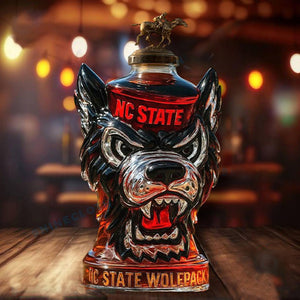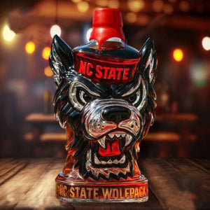 Keywords: NC State Wolfpack, Whiskey Bottle, Custom Bottle, Glass Bottle, College Sports, Football, Basketball, Wolfpack, North Carolina State University, Home Bar, Man Cave, Gift, Red Wine, Cocktails, Unique Design
