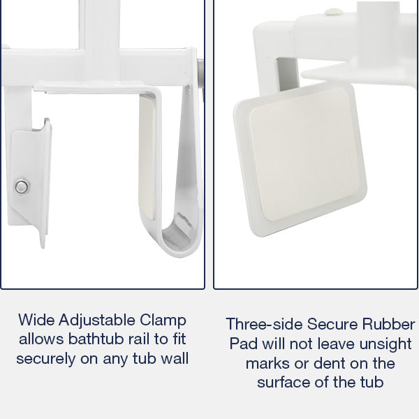 - Adjustable Fit + Tool-Free Setup – Clamp width adjusts to fit tub walls 3.1”–7.8”. Installation is quick and does not require tools. Designed to protect bathtub surfaces without leaving marks. *Not recommended for fiberglass tubs.