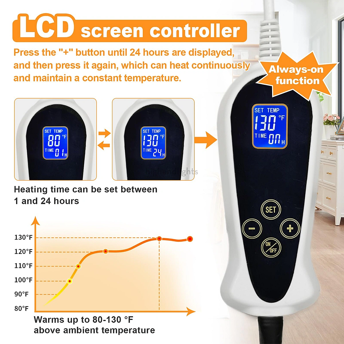 LCD temperature and timer control: Adjustable 80–130℉ / 27–55℃ range with 1–24 hour scheduling and optional continuous heating mode.
