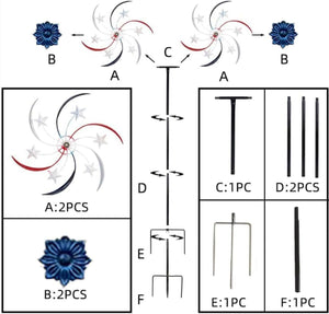 Two types of installation: 1. Same direction installation 2. Reverse installation. This wind spinner features a vibrant red, white, and blue color scheme, perfect for celebrating Independence Day or adding a touch of Americana to your outdoor space.