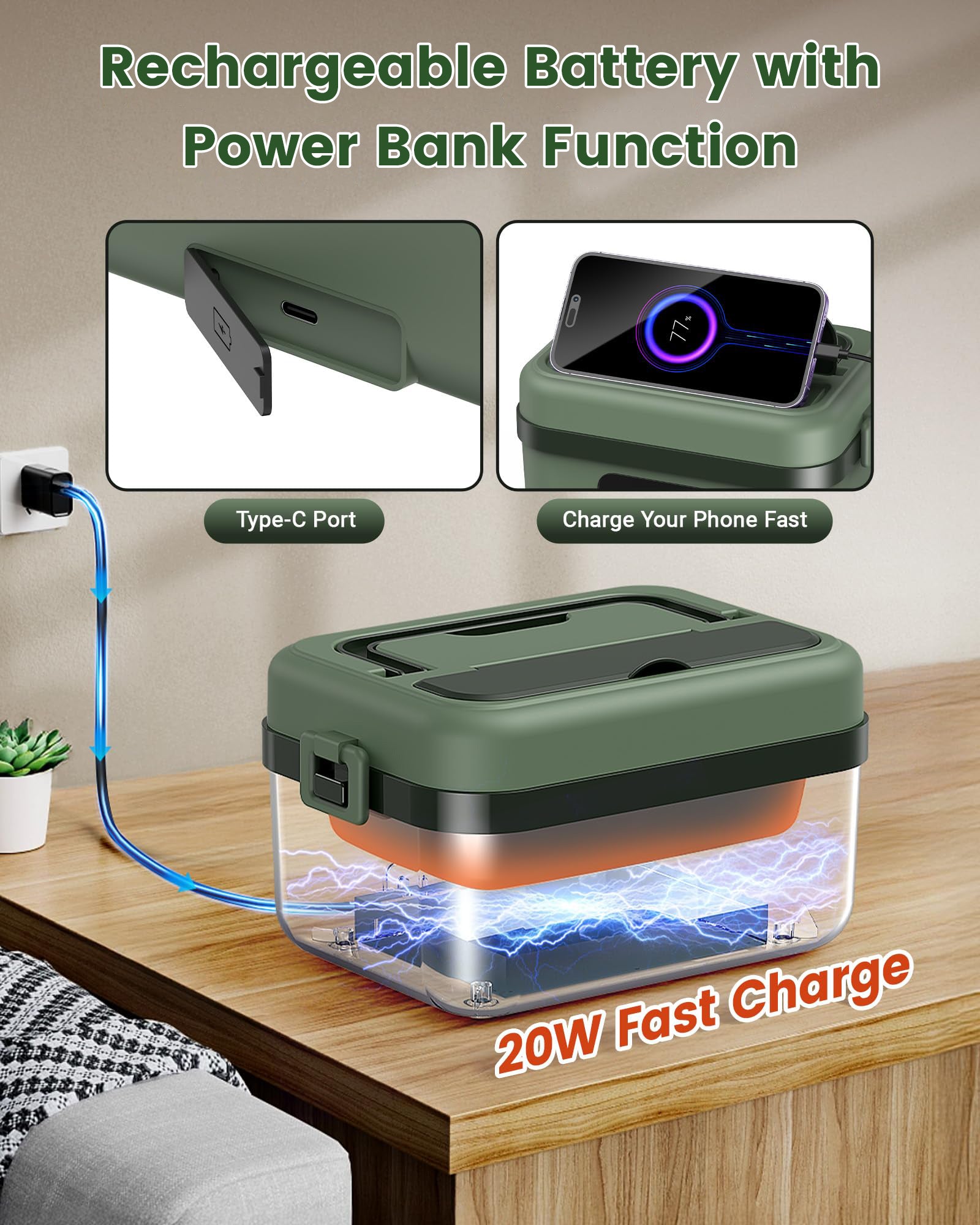 Equipped with a 16000mAh battery and 20W fast charging, this lunch box heats food without needing a power outlet and can also serve as a backup power source for small devices. -